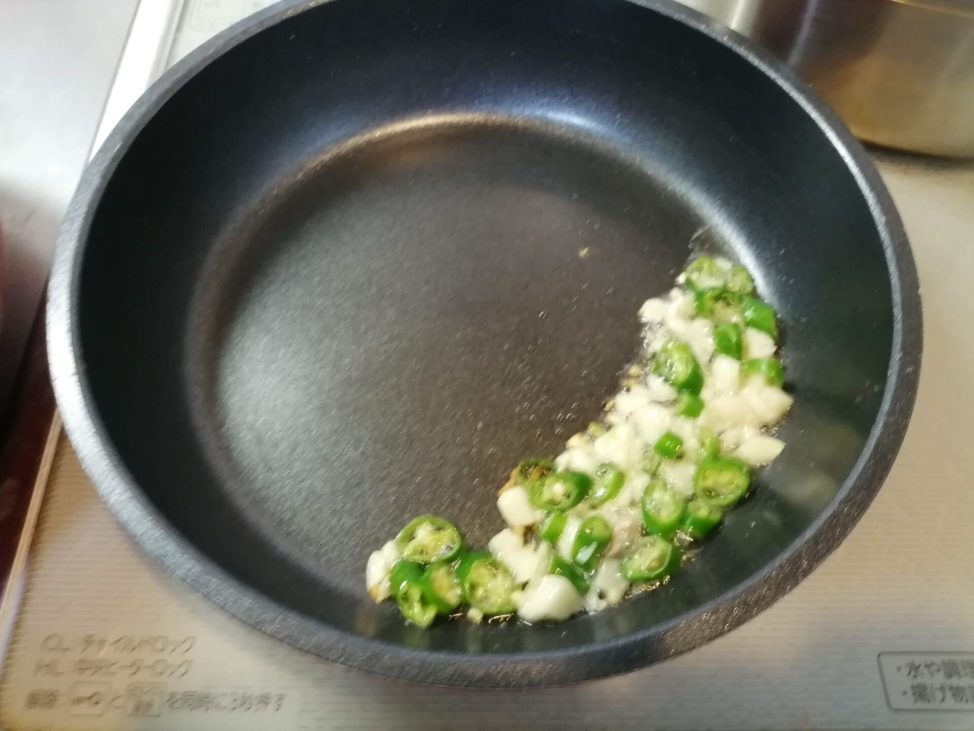 ▼にんにく、青唐辛子を油でいためる